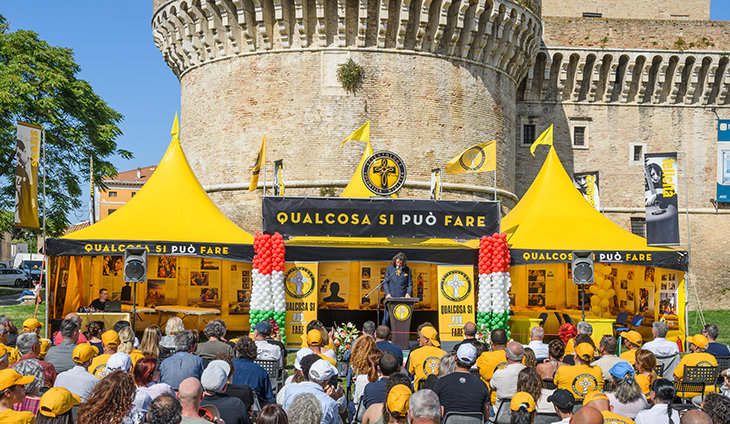 Der leuchtend gelbe Pavillon der Europäischen Kontinentalen Cavalcade der Scientology Ehrenamtlichen Geistlichen kam in Senigallia, Italien, an und stand stolz vor der historischen Rocca Roveresca. Die Ausstellung brachte ihre Botschaft der Hilfe in die Stadt, zusammen mit praktischen Lösungen und Ausbildung, um den Geist des Ehrenamts zu stärken, der das Herzstück des italienischen Lebens ist.